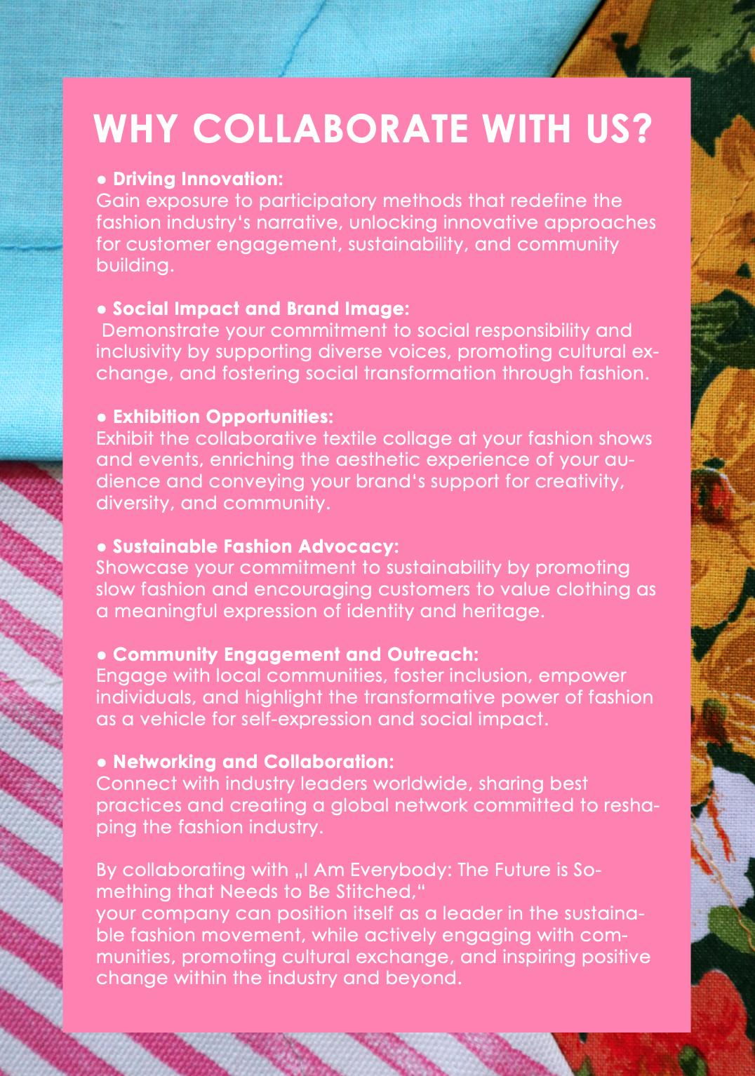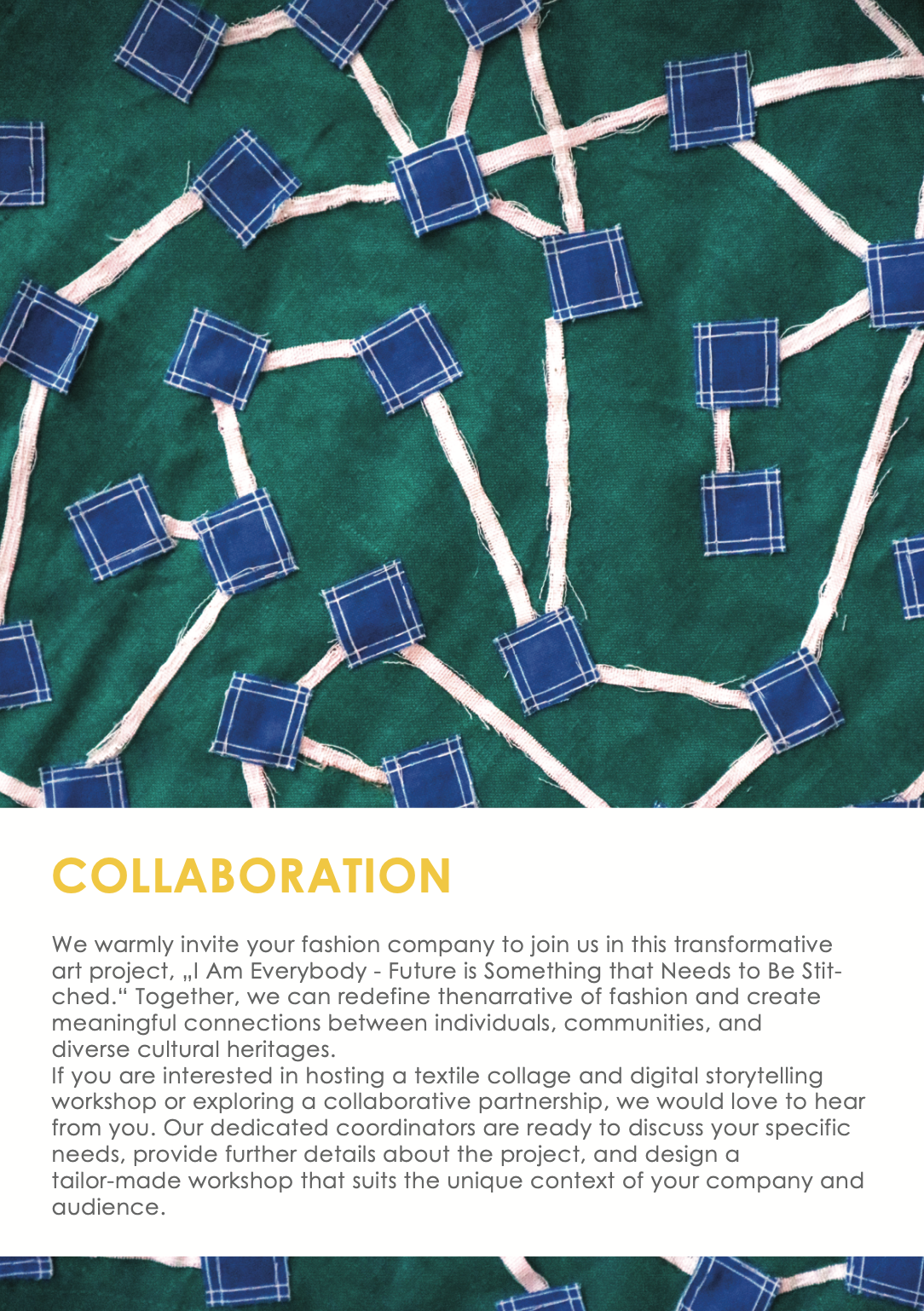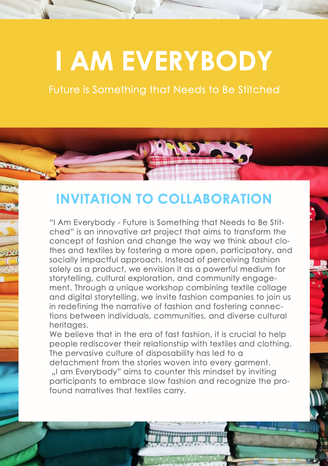 „I Am Everybody – Future is Something that Needs to Be Stitched” is an innovative art project that reshapes our perception of fashion by embracing it as a medium for storytelling, cultural exploration, and community engagement. This project combines textile collage and digital storytelling to invite fashion companies to join us in transforming the narrative of fashion. By celebrating personal stories, diverse cultures, and the power of textiles, we create a tapestry of unity, sustainability, and creative expression. Learn more about our collaborative workshops and the vision to bring this impactful artwork to museums worldwide. Explore the full project details here.